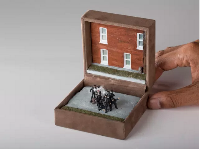 而Talwst在制作這些場景事會根據(jù)一些事件來做,將他們記錄下來。他作為有色人種,特別關(guān)注種族歧視和殖民主義相關(guān)的事件,因為自己就曾因為看起來“可疑”被警察盤問,所以深有感觸。他有兩個知名作品就是根據(jù)2014年發(fā)生在美國的邁克爾·布朗命案和埃里克·加納死亡案進(jìn)行的創(chuàng)作。