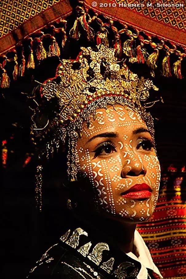 這是菲律賓Yakan民族的傳統服飾。他們婚禮分為兩場,分別是伊斯蘭式和古老的傳統儀式。臉上的圖案是吉祥的象征。