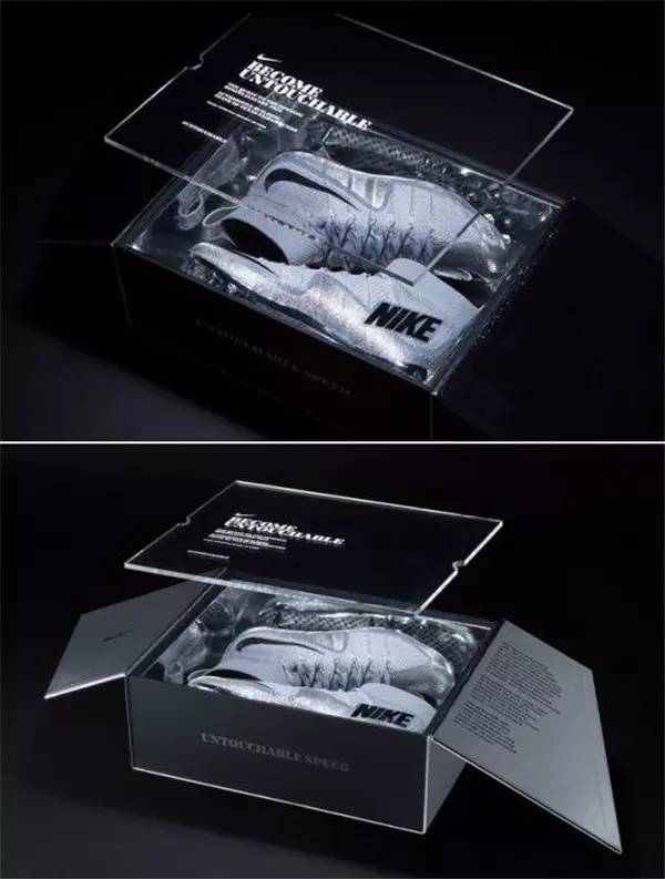 有透明設計的鞋盒,可以通過透明的包裝設計部分一覽這鞋子的芳容,看到它完好無損你才會將它收入囊中。