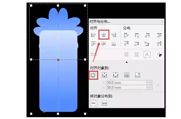 設計服裝吊牌的第四步:居中對齊 使用“矩形工具”繪制矩形,在屬性欄中設置矩形“圓角半徑”為6。復制上一步驟中填充色;選擇兩個造型,執行“窗口”→“泊塢窗”→“對齊與分布”命令,首先選擇對齊對象到“活動對象”,對齊方式選擇“水平居中對齊”,如圖所示。