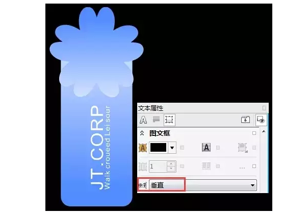 設計服裝吊牌的第六步:輸入文字 用“文本工具”單擊,調整“文本屬性”為“垂直文本”輸入服裝品牌名稱,分別執行一次“水平鏡像”和“垂直鏡像”達到如圖所示效果。