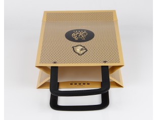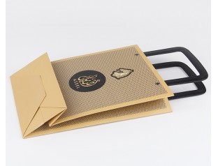 此款紙袋制作采用特種紙,商標燙金,加上PU皮手提繩。手提袋設計的手提處選用了黑色PU皮,高檔紙袋手提繩打雞眼,提高了手提紙袋的承受力。廣州駿業(yè)紙袋廠家,專業(yè)16年印刷包裝行業(yè),免費設計,量身定制,想了解更多手提紙袋,歡迎致電:020-66677799
