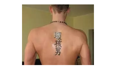 還有這一位Bad Boy,酷到衣服都不穿直接文身,可是親,你這個(gè)語序,已經(jīng)酷到深處自然萌了,更別提那描紅一般的正楷字體, 真是不能更正經(jīng)。
