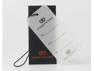 此款衣服吊牌制作采用黑卡紙,商標燙紅金,加上一張PVC塑料片。