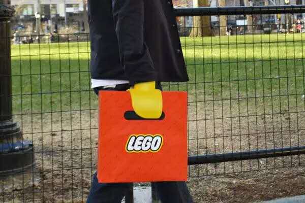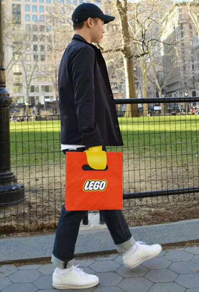 樂高積玩具是一種塑膠積木,風靡全球。有天,紐約視覺藝術學院的兩位學生Junho Lee和Hyun Chul Choi的就把樂高積木元素放到到手提的購物袋上,創作出只要提起紙袋手就變成跟樂高人偶一樣的形狀,這樣充滿玩心的設計一出當然又被一片「想買」的聲音給淹了。