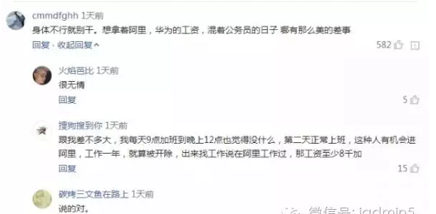 在這樣高強度的工作環境下自然會有一些人覺得這是不可承受之重,這不,前幾天就有阿里員工在微博上發表了題為《工號105751實名投訴阿里巴巴,終于我被你們逼死了》的公開信,文末有自殺傾向。阿里對此回應:目前最重要的是幫助此員工走出心理難關,公司已聯系相關專家。對于這條控訴本以為會有很多人罵阿里的不人性,但讓人出乎意料的是大多數網友反而卻該員工“吃得咸魚抵得渴”,既然拿著阿里的工資就不要想著能混著公務員的日子云云,有評論截圖為證。