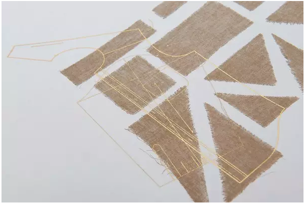 設(shè)計師說,在做這個設(shè)計的時候,腦袋中浮現(xiàn)著一幅很溫暖的畫面,一位母親在給她的孩子縫制新衣服,她先用粉筆把衣服的版型圖畫在布料上,再按著布料上的輪廓進行裁剪、縫紉,于是一塊普普通通的布料就神奇的成為了一件衣服。讓人不禁想起了“慈母手中線,游子身上衣,臨行密密縫,意恐遲遲歸”這首詩。于是設(shè)計師遵循著溫暖的畫面,在整一塊面料上按照文字的筆畫結(jié)構(gòu)進行裁剪,用裁剪后被分解的面料重新組合成了新的文字。一針一線的縫制既視感是否會讓你想起媽媽的手呢?